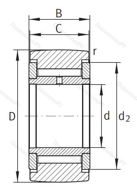 Игольчатый подшипник NATV 25 в своей неразъемной конструкции имеет иглоролики, находящиеся в наружной толстостенной обойме, и зафиксированные на внутреннем кольце боковые диски. Сепаратор может присутствовать либо отсутствовать: в первом случае повышается ударопрочность и скорость вращения, но снижается грузоподъемность, и наоборот.