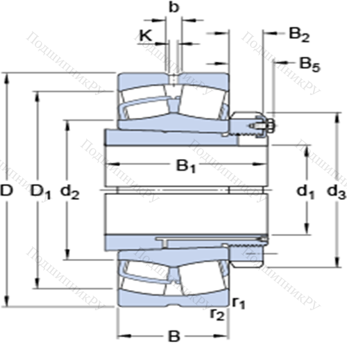 Сферические роликоподшипники на закрепительной втулке 23952 CCK/W33 + OH 3952 H у которого конструкционной особенностью являются ролики в форме конуса и разъемный корпус. Изделие также может быть укомплектовано наружным кольцом с упорным бортиком или большим углом, двухрядными или четырехрядными роликоподшипниками, утолщенной внешней шиной.