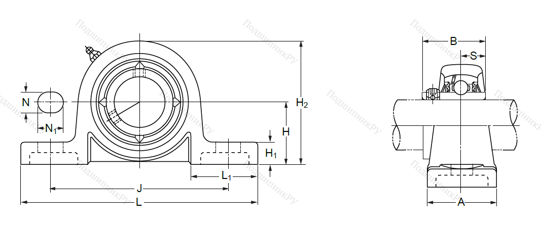 В конструкцию детали входит корпусный подшипник типа UC, установленный в корпус типа Р из чугуна с нишей сферической формы. Монтаж на вал осуществляется посредству кольца, оснащенного парой штифтов, закручиваемых шестигранником, что обеспечивает самовыравнивание.