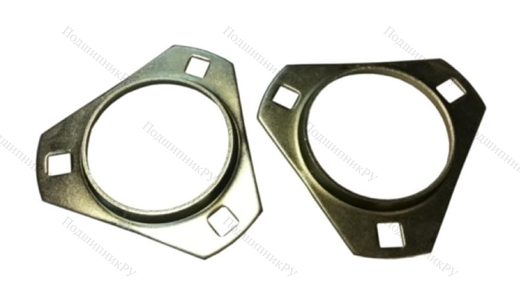 Фланцевая подшипниковая конструкция треугольной формы с тремя квадратными отверстиями, расположенными по углам и предназначенными для установки системы на вертикальной поверхности опоры. Состоит из двух одинаковых частей, созданных методом глубокой вытяжки во время штамповки. Установка на валу происходит посредству эксцентрикового кольца либо стопорных винтов. В зависимости от производителя, изделие может иметь метрические или дюймовые размерные параметры.